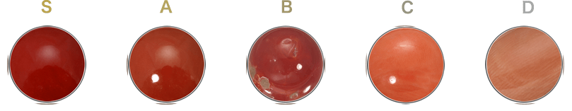 画像Sのように赤色が濃く、わずかに深みと暗みの入った血赤色が一番価値の高い物となります。