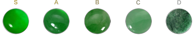 ヒスイは画像S~Dのように美しいグリーンから、薄い、くすんだグリーンと、色みは様々ですが、