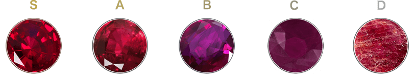 非加熱のルビーは画像S~Dのように鮮やかなレッドから、くすんだレッドと色みは様々ですが、